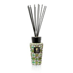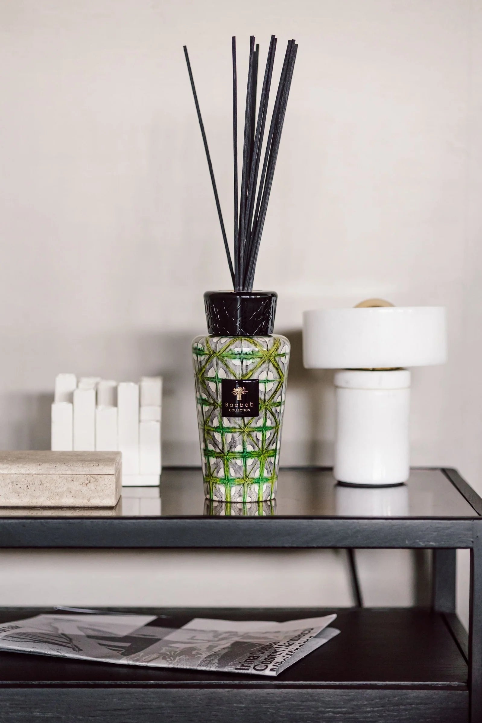 The glass of the Lazlo fragrance diffusers is covered with a graphic grey and green sublimated pattern. Available in our range of large Totem diffusers in 2 l and 5 l, they are finished with a two-tone ceramic cap, hand-glazed by our Portuguese craftsmen. Also available as a 500 ml bottle in the Lodge range, the Lazlo perfume diffusers will spread a fresh and woody fragrance throughout your home