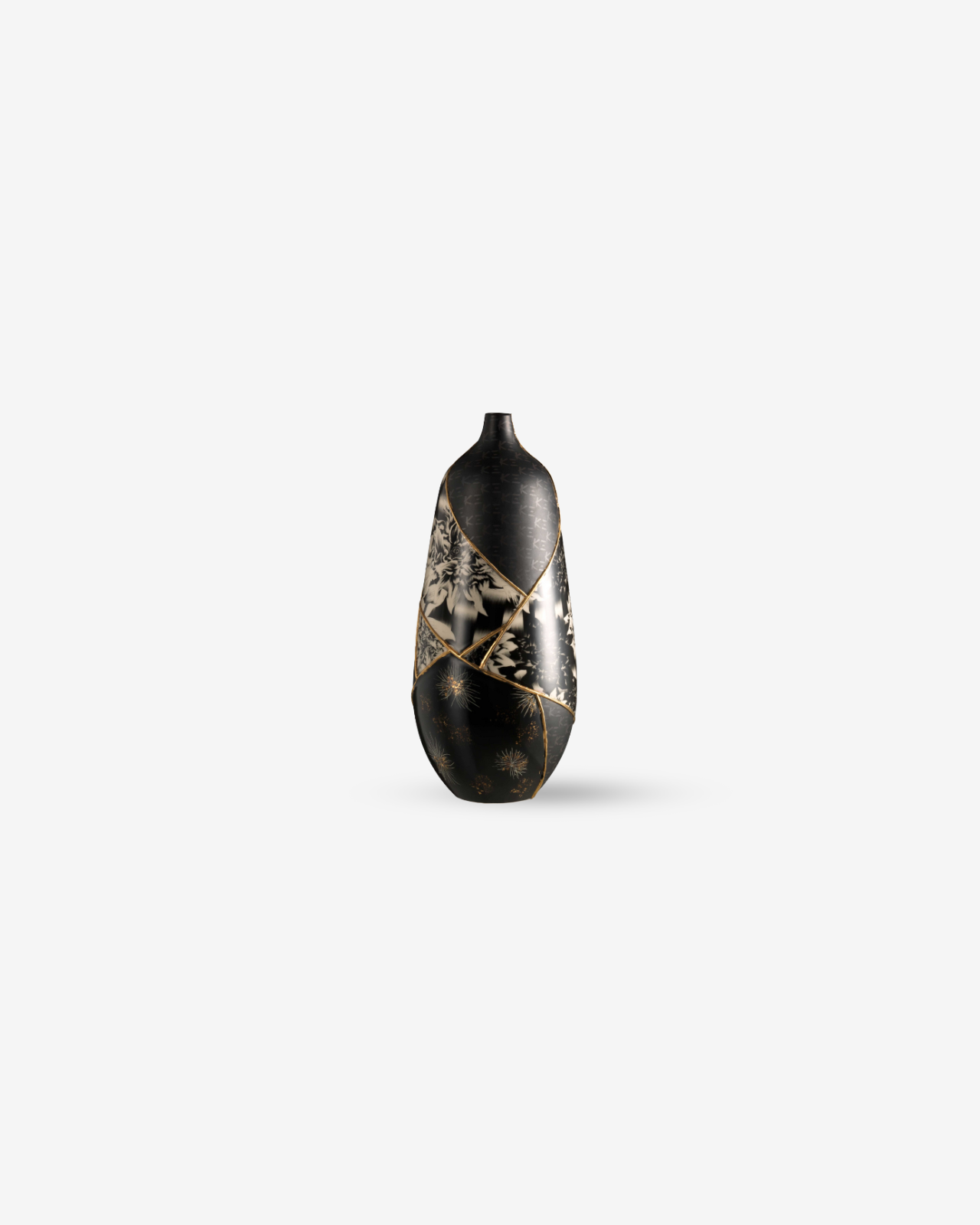 Objects inspired by the Japanese art of repairing broken pieces with gold; kintsugi. Hand thrown clay vase in various black and white glazed finishes, with a collage of decorations divided by a gold rilievo.