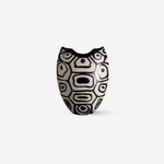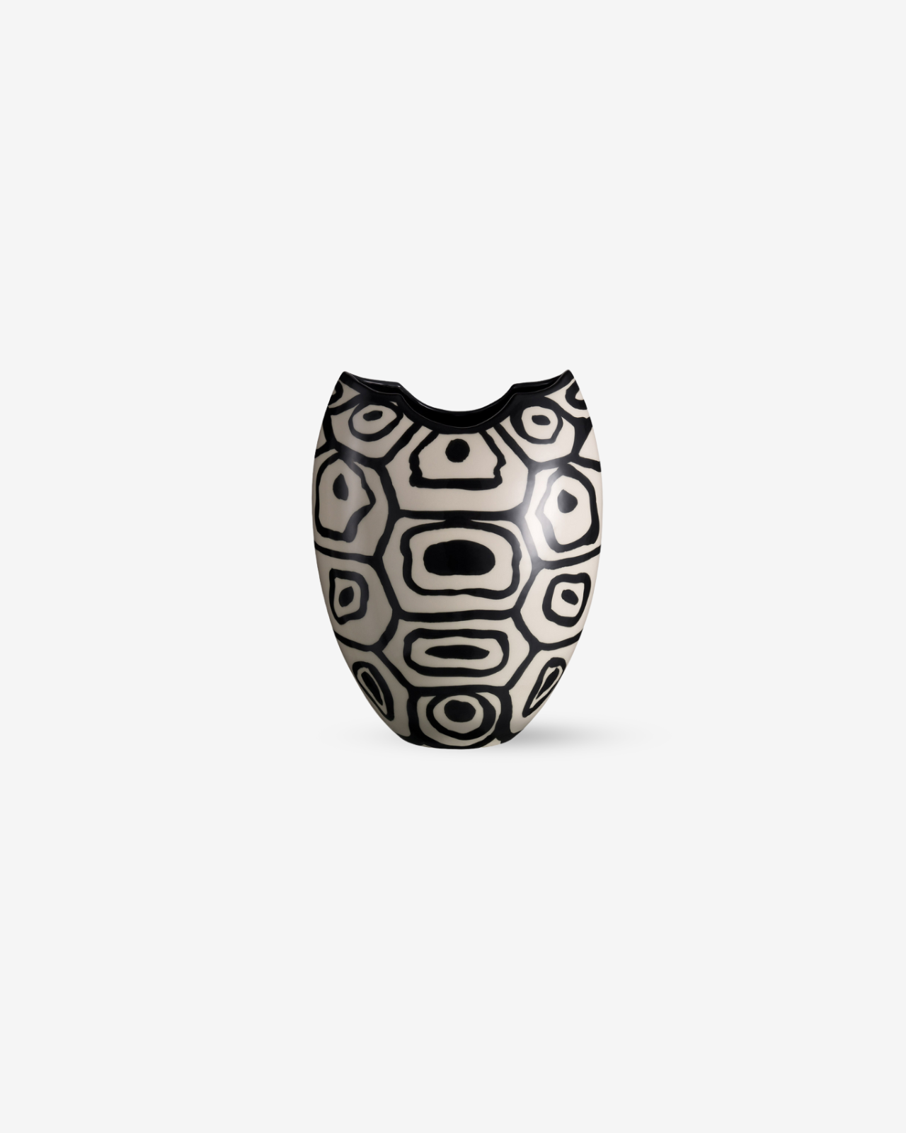 The sinuous and irregular lines of the tortoise shells create dreamy patterns. Clay vase, shaped, cut and folded by hand with white engobe and black glaze, decorated by hand with a transparent glaze finish.