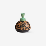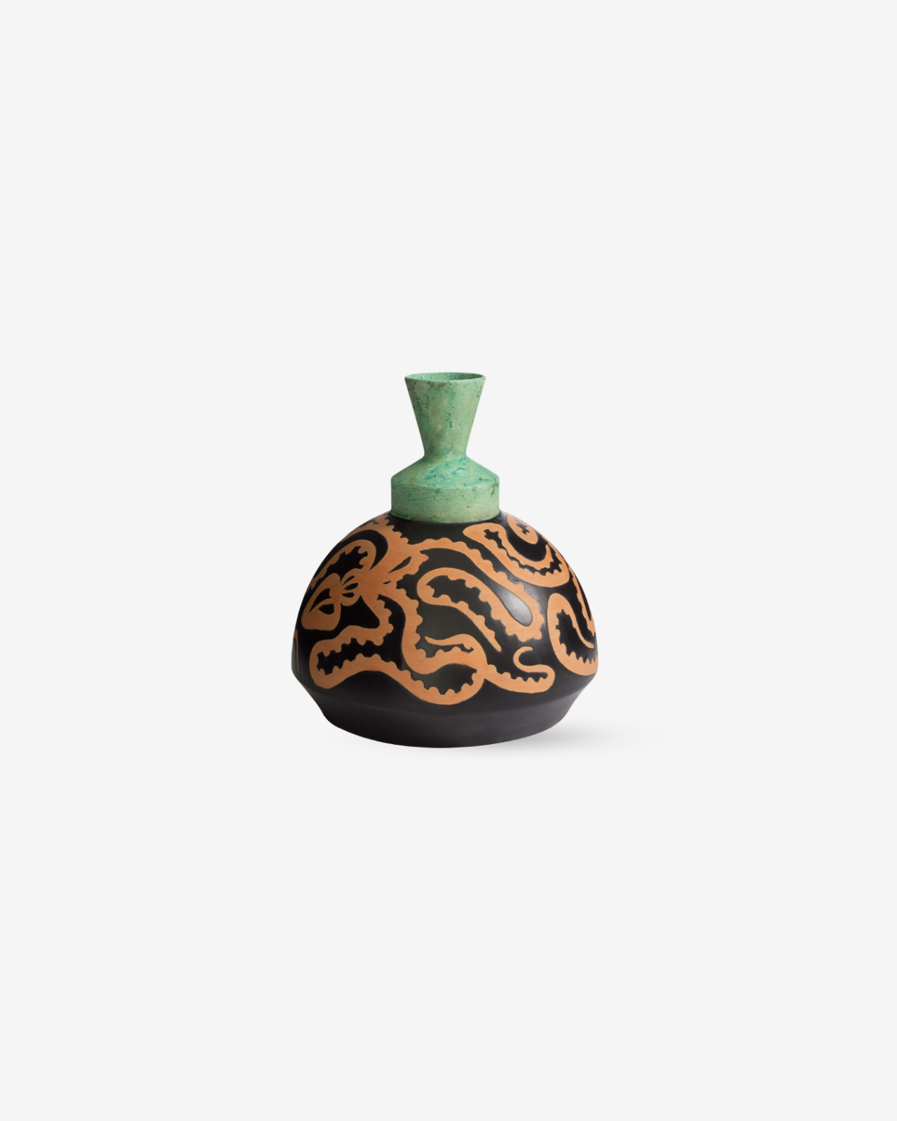 The evocation of a protagonist of the Atreids drama. Clay vase, hand thrown with an oxidized copper finish, matte black glaze and waxed terracotta.